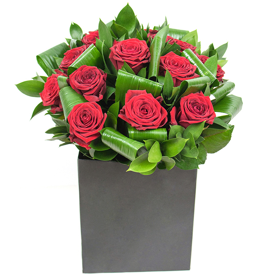 Embrace the exquisite charm of our Luxurious Red Rose Arrangement. This bouquet features a captivating blend of deep red roses, vibrant aspidistra leaves, and graceful ruscus, creating a visually stunning centerpiece for any occasion.