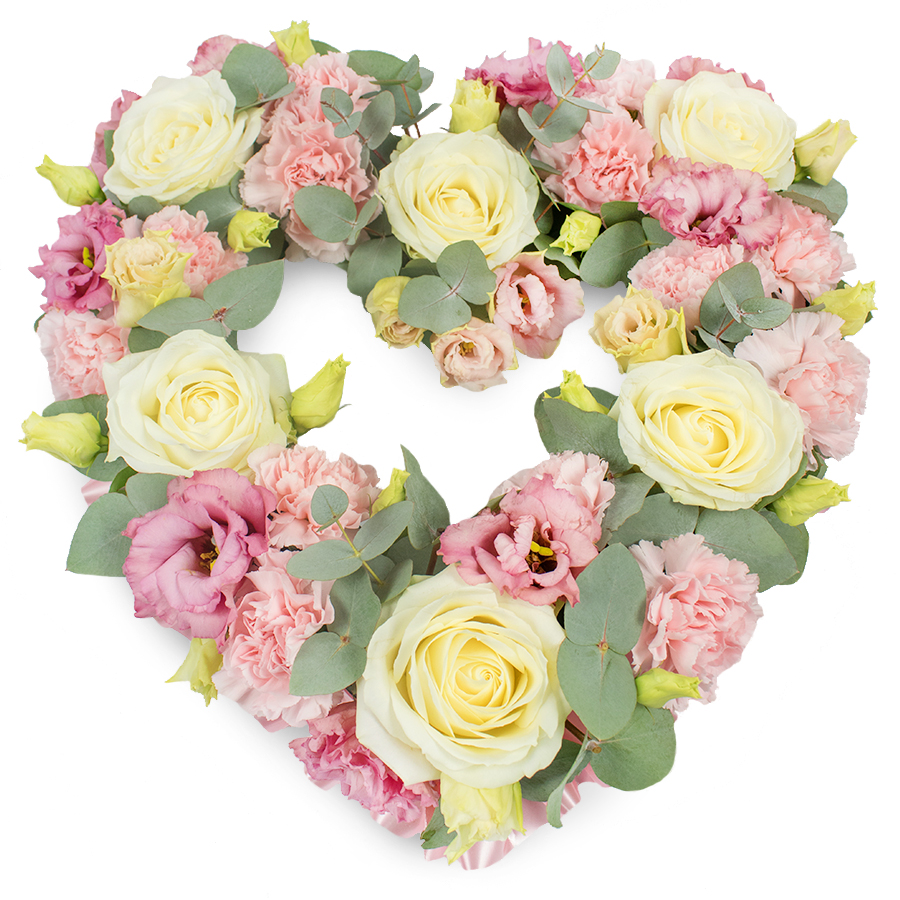 Show your heartfelt sentiments with our Radiant Open Heart Tribute Arrangement, thoughtfully crafted to honor and remember your loved one. This breathtaking bouquet combines a harmonious blend of white roses, pink carnations, pink lisianthus, and eucalyptus leaves, all hand-selected for their exceptional freshness and beauty.
